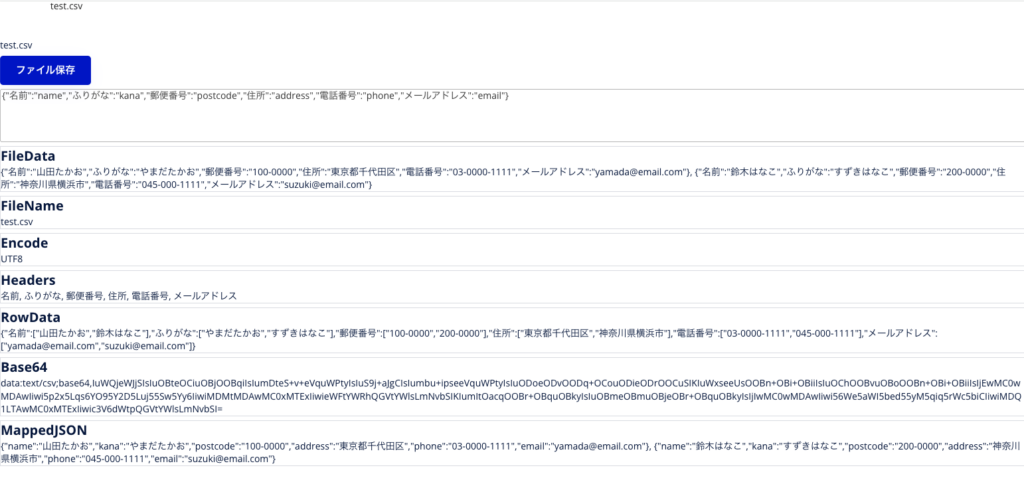 | mapped_base64 | ヘッダーを書き換えたCSVファイルのbase64形式 |